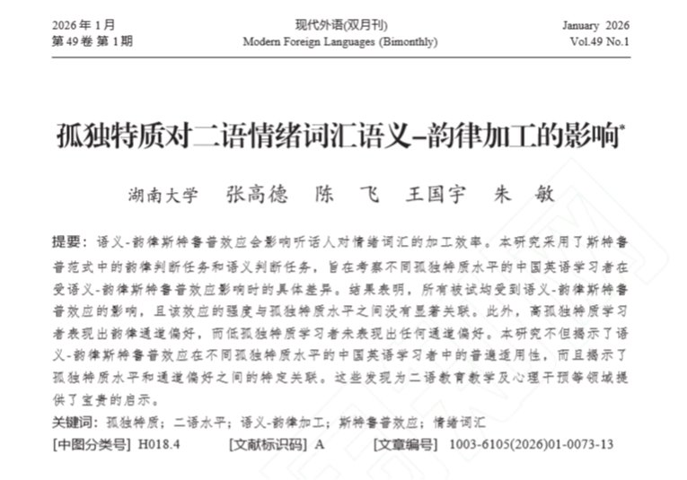 张高德、陈飞、王国宇、朱敏在《现代外语》发文:孤独特质对...